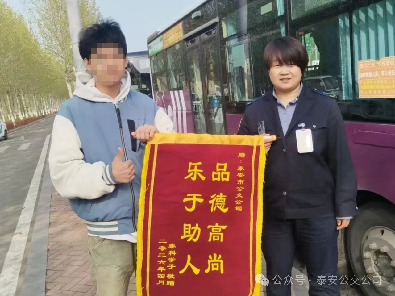4月10日上午,泰山科技學院狄同學將一面印有“品德高尚 樂于助人”的錦旗,送至泰安公交第三分公司1路終點站,親手交到公交駕駛員劉俊芝手中,向熱心相助的劉俊芝及分公司工作人員、線路公交駕駛員表達誠摯謝意